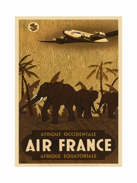 Une reproduction de l’affiche Air France « Afrique occidentale – Afrique équatoriale ». L’illustration vintage met en avant des éléphants, symboles de la faune emblématique africaine, qui dominent la scène.