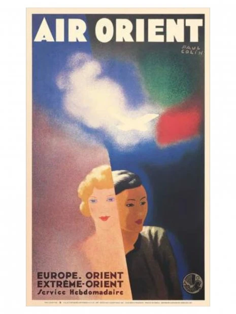 Reproduction de l’affiche publicitaire Air France publié en 1929, promouvant les destinations vers l’Europe et de l’Extrême Orient disponible toutes les semaines par Air Orient.