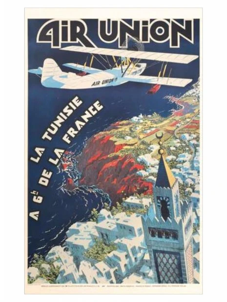 Reproduction de l’affiche publicitaire Air France publié en 1929, promouvant la liaison de la France vers Tunisie en 6h de vol, à l’époque de Air Union.