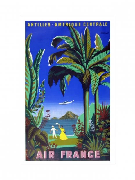 Une reproduction d’une affiche Air France « Antilles – Amérique centrale », qui évoque une ambiance exotique avec ce superbe paysage tropical et paradisiaque.
