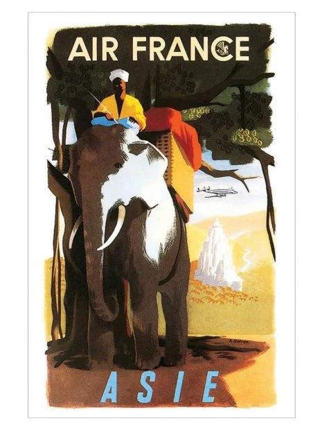 Reproduction d’une affiche publicitaire vintage d’Air France des années 1950, illustrée à l’époque par André GOLVEN, mettant en avant un éléphant d’Asie.