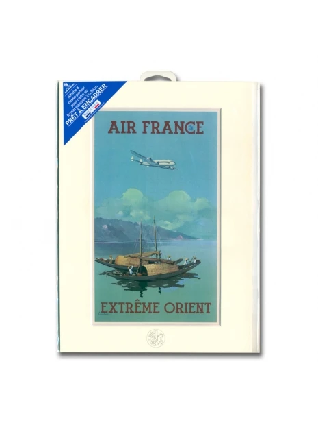 Une superbe reproduction d’une affiche Air France représentant l’Extrême Orient. Dans un décor pittoresque qui évoque les bateaux de pêche traditionnels de l’ancienne colonie, un avion super constellation vient survoler un coin de baie indochinoise.