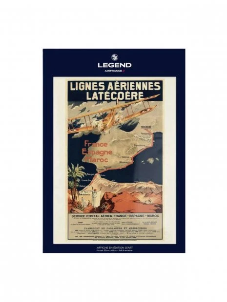 Une affiche représentant les lignes aériennes G.Latécoère, destinée à l’affichage dans les agences de voyage et reproduite sur un papier vergé. Cette affiche a été imprimée pour la 1ère fois en 1919 puis rééditée en 1998.