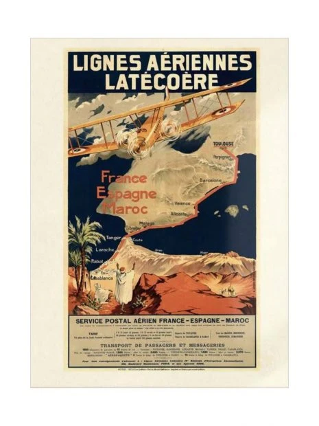 Une affiche représentant les lignes aériennes G.Latécoère, destinée à l’affichage dans les agences de voyage et reproduite sur un papier vergé. Cette affiche a été imprimée pour la 1ère fois en 1919 puis rééditée en 1998.
