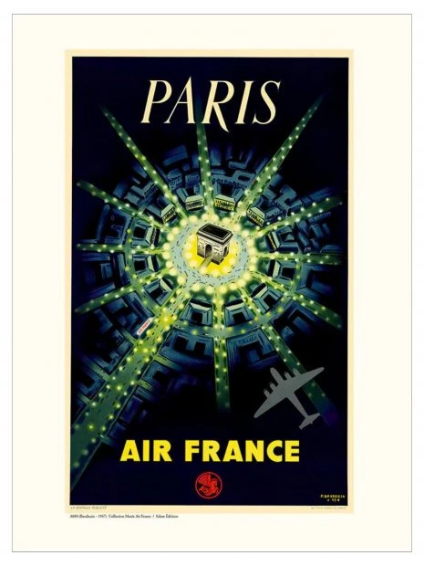 Imprimée sur du papier vergé de haute qualité, cette affiche marie l’histoire d’Air France à l’élégance intemporelle de Paris, incarnée par l’illustration de l’Arc de Triomphe.