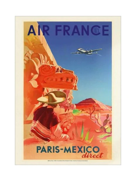 Une reproduction d’une affiche de voyage d’Air France imprimée sur un papier vergé, faisant la promotion du tourisme de Paris au Mexique avec une Super-Constellation de Lockheed survolant les pyramides emblématiques de Teotihuacan.
