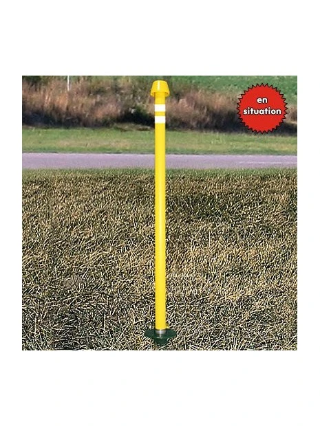 Ces marqueurs permettent de délimiter les extrémités des pistes et des voies de circulation. La base est dotée d’un ressort qui permet d’absorber l’onde de choc si le marqueur est impacté par un véhicule ou un avion. Le marqueur peut être enlevé lorsque le terrain est tondu. Il comprend deux bandes réfléchissantes en haut du marqueur pour une meilleure visibilité la nuit.