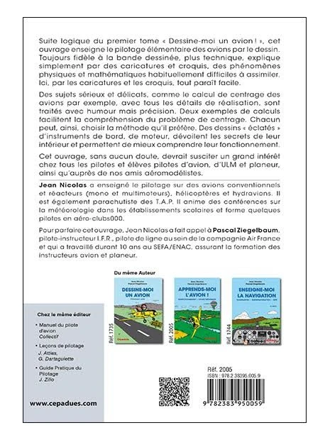 Suite logique du premier tome « Dessine-moi un avion ! », cet ouvrage enseigne le pilotage élémentaire des avions par le dessin. Toujours fidèle à la bande dessinée, plus technique, explique simplement par des caricatures et croquis, des phénomènes physiques et mathématiques habituellement difficiles à assimiler. Ici, par les caricatures et les croquis, tout paraît facile. Des sujets sérieux et délicats, comme le calcul de centrage des avions par exemple, avec tous les détails de réalisation, sont traités avec humour mais précision. Deux exemples de calculs facilitent la compréhension du problème de centrage. Chacun peut, ainsi, choisir la méthode qu’il préfère. Des dessins « éclatés » d’instruments de bord, de moteur, dévoilent les secrets de leur intérieur et permettent de mieux comprendre leur fonctionnement. Cet ouvrage, sans aucun doute, devrait susciter un grand intérêt chez tous les pilotes et élèves pilotes d’avion, d’ULM et planeur, ainsi qu’auprès de nos amis aéromodélistes.