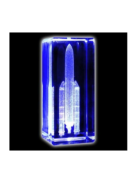 Ariane gravée au laser dans un bloc de verre optique (qui offre la même pureté que le cristal).