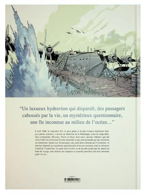 6 avril 1948, le plus grand et le plus luxueux hydravion français jamais construit, s’envole en direction de la Martinique avant de disparaître. Aux commandes, Marceau, Victor et Alice, trois amis, anciens vétérans, qui ont vécu l’enfer de la 2e Guerre mondiale et qui sont persuadés qu’une 3e est imminente. Quant aux 44 passagers, eux aussi bien cabossés par l’existence, ils ont tous répondu au mystérieux questionnaire d’un jeu concours pour se retrouver à bord de l’hydravion. Le petit coin d’enfer ou de paradis perdu qui les attend au bout du voyage, leur réserve des surprises et pourrait peut-être bien leur redonner goût à la vie…