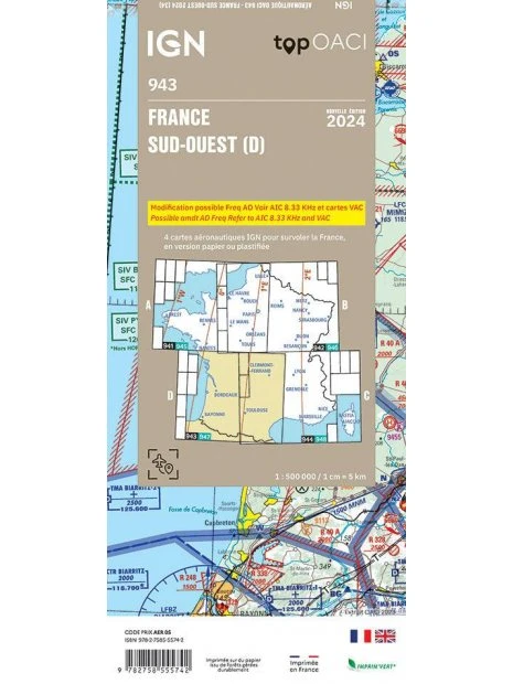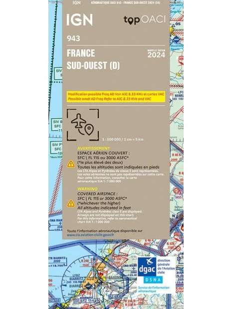 Cette carte de navigation au 1/500 000e, pour le vol dans le quart Sud-Ouest de la France, couvre l’espace aérien jusqu’au niveau de vol 115 et regroupe toutes les informations nécessaires pour le vol à vue (VFR).