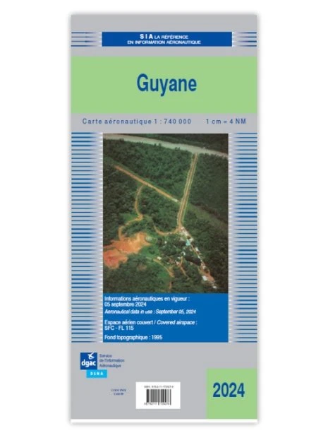 Cette carte aéronautique de vol à vue couvre tout l’espace aérien de la Guyane Française.