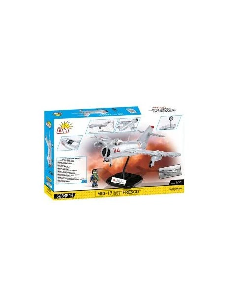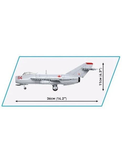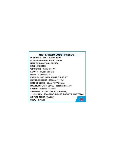 Ce modèle MIG-17 a été conçu à l’échelle 1:32 et se compose de 568 éléments de haute qualité. Tous les marquages, emblèmes et inscriptions sur le modèle sont des impressions qui ne s’usent pas pendant l’utilisation. L’ensemble comporte des éléments mobiles tels que des roues et un cockpit ouvrant, dans lequel nous pouvons placer une grande figurine de pilote. Le camouflage reproduit à partir des briques est particulièrement beau. Le kit est livré avec un présentoir avec une plaque avec le nom du kit et la nationalité. Grâce aux instructions intuitives basées sur des icônes claires, la construction est simple. L’avion est un must pour tous les fans d’aviation et de technologie militaire. C’est également un complément parfait aux collections des Forces armées, de la guerre du Vietnam, de la guerre froide et de la guerre de Corée. Dans cette série, nous avons également sorti des avions polonais LIM-1 et LIM-5, des MIG-15 soviétiques, des S-102 et MIG-17 tchécoslovaques dans la version pour le Vietnam, l’Allemagne de l’Est et l’URSS. L’ensemble en briques a été entièrement fabriqué en Pologne dans l’Union européenne.