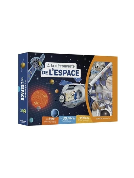 La boîte comprend un livre documentaire de 64 pages pour tout savoir sur l’espace, ainsi qu’une trentaine d’aimants à replacer sur un grand plateau.