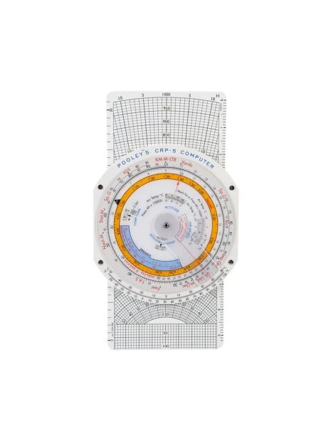 Conçu spécialement pour le pilote professionnel, le CRP-5 comprend toutes les fonctions nécessaires pour les examens de pilote professionnel et de pilote de ligne. Il se compose d’une règle à calcul circulaire avec curseur clair et durable pour le calcul et la conversion de la température, du temps, de la distance, du volume, de l’altitude, de la vitesse, du poids, du carburant, de l’endurance, de la multiplication et de la division, de la règle de 1 sur 60, de la correction de la compressibilité, etc. Les échelles et les lettres en couleur améliorent grandement l’utilisation et la clarté. Le côté du triangle des vents comprend une échelle coulissante avec une plage de vitesse de 40 à 1000 et des échelles de mesure sur les bords extérieurs de 1:500 000 NM, 1:250 000 NM, en pouces et en millimètres. Enfin, le CRP-5 possède un disque rotatif transparent pour le traçage à la mine de plomb.
