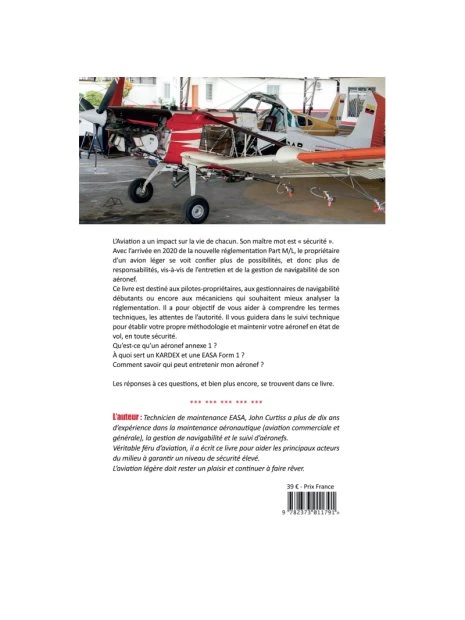Ce livre est destiné aux pilotes-propriétaires, aux gestionnaires de navigabilité débutants ou encore aux mécaniciens qui souhaitent mieux analyser la réglementation. Il a pour objectif de vous aider à comprendre les termes techniques, les attentes de l’autorité. Il vous guidera dans le suivi technique pour établir votre propre système et maintenir votre aéronef en état de vol, en toute sécurité.
