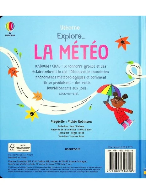 Ce livre attrayant et ludique invite les enfants à comprendre la météo. Au fil des pages illustrées, ils découvriront des explications fascinantes sur ce qui provoque la pluie, la neige, le tonnerre, les éclairs, les ouragans, les arcs-en-ciel…