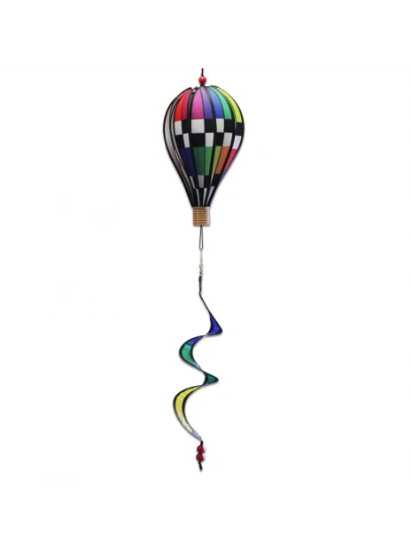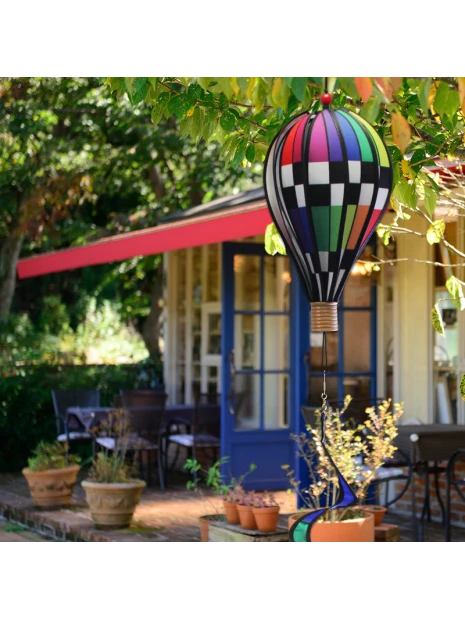 Girouette décorative à suspendre représentant une montgolfière pour l’extérieur. Le vent fait tourner la roue et l’ensemble pivote sous l’effet du courant d’air !