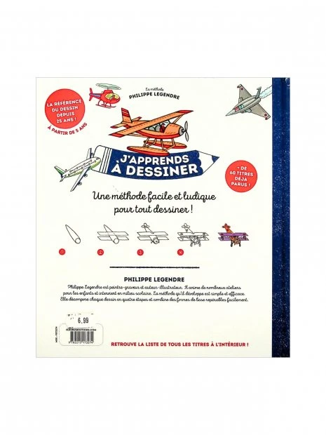 Une méthode reconnue et facile, en quatre étapes, pour apprendre à dessiner comme les grands ! Le vocabulaire des formes permet à l’enfant de réussir tous ses dessins. Ce livre présente 9 modèles d’avions : l’avion de tourisme, le chasseur, l’hélicoptère, l’avion-cargo, le biplan, l’avion furtif, l’hydravion, le gros-porteur, l’ULM.