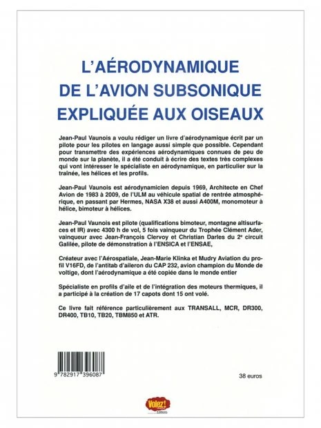 Jean-Paul VAUNOIS est aérodynamicien depuis 1969, «architecte en chef avion», de l’ULM au véhicule spatial de rentrée atmosphérique, en passant par Hermès, le X38 de la NASA, l’A400M. Mais il est également pilote avec 4300 h de vol, 5 fois vainqueur du Trophée Clément Ader. Il a rédigé ce livre d’aérodynamique à l’attention des pilotes dans un langage le plus simple possible.