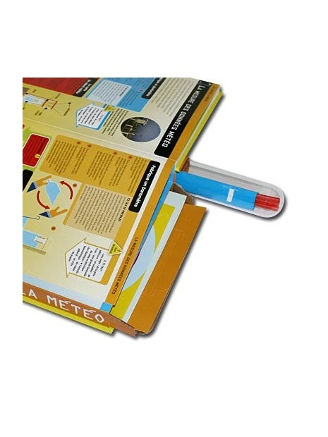 Le kit contient : un tube à essai, un thermomètre, 4 coupelles, 5 pailles, un moyeu et une tige en plastique plus 12 pièces cartonnées détachables pour réaliser les expériences et construire, par exemple, une anémomètre, un pluviomètre, un moulin à vent, etc.