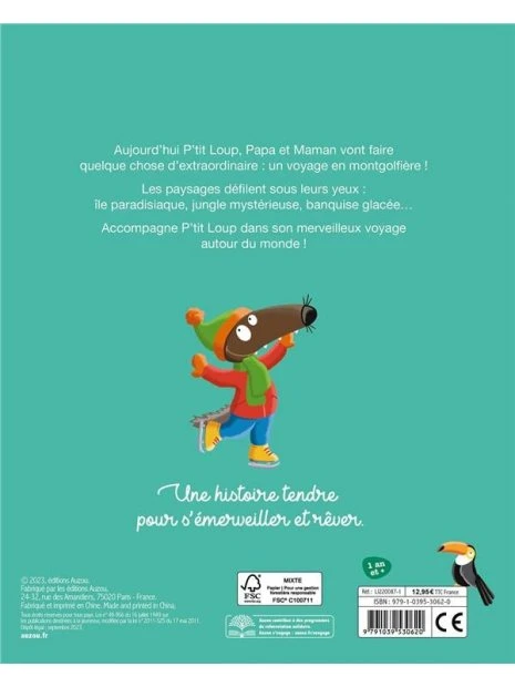 P’tit Loup s’envole à bord d’une montgolfière mais celle-ci dérive vers des régions lointaines… Aurores boréales en Arctique, Lion en Afrique…