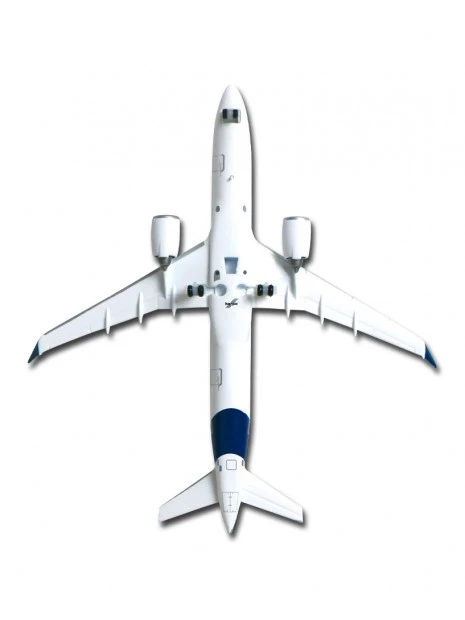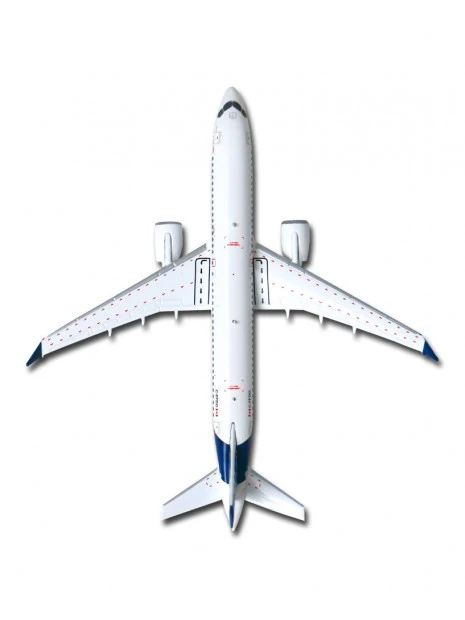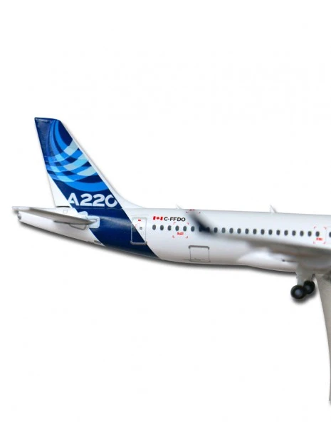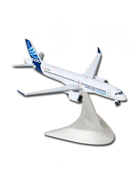 Maquette métal Herpa, au 1/500e, d’un A220-300 aux couleurs d’Airbus avec train d’atterrissage sorti.