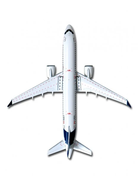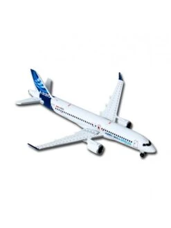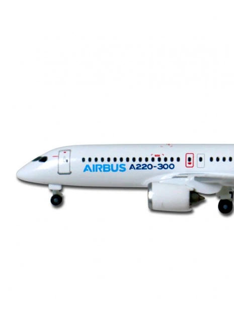 Maquette métal Herpa, au 1/500e, d’un A220-300 aux couleurs d’Airbus avec train d’atterrissage sorti.