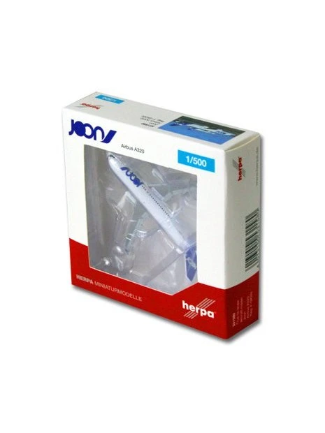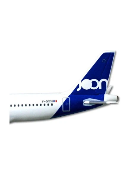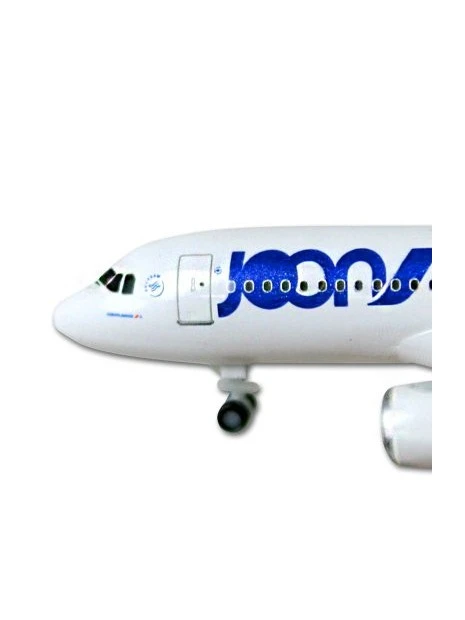 Maquette métal Herpa, au 1/500e, d’un Airbus A320 aux couleurs de la toute jeune compagnie Joon (filiale d’Air France) avec train d’atterrissage sorti.