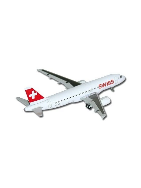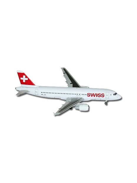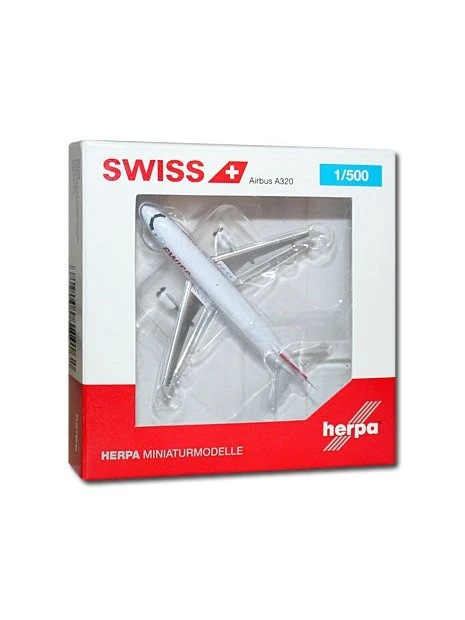 Maquette métal Herpa, au 1/500e, d’un Airbus A320 aux couleurs de la compagnie Swiss Airlines avec train d’atterrissage sorti.