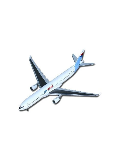 Maquette métal Herpa, au 1/500e, d’un A330-300, aux couleurs de la compagnie Air Inter, avec train d’atterrissage sorti.