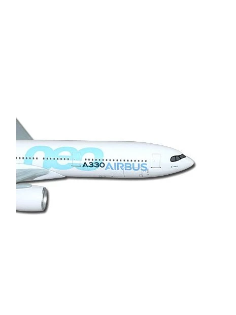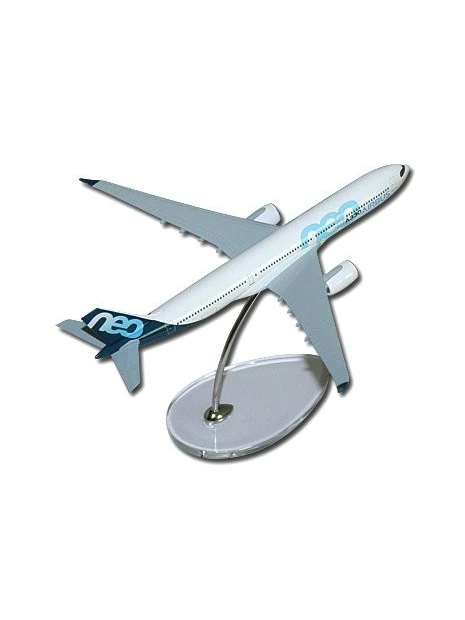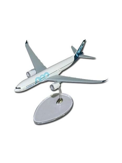 Maquette métal Airbus, au 1/400e, d’un Airbus A330neo aux couleurs de la maison mère avec socle et sans train d’atterrissage.