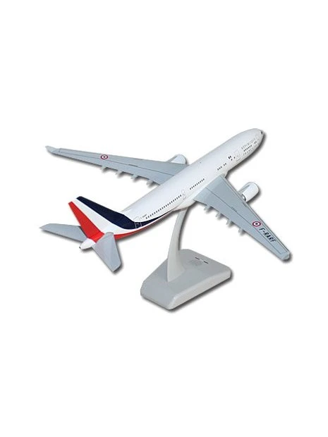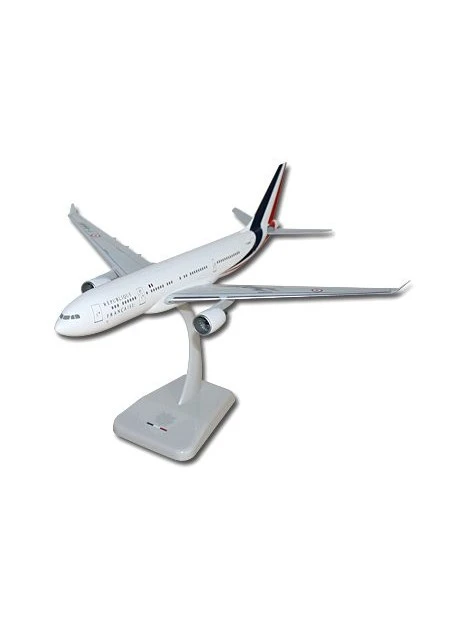 Maquette plastique, de l’Airbus A330 présidentiel français, à l’échelle 1/200e, posé sur socle et trains d’atterrissage sortis.
