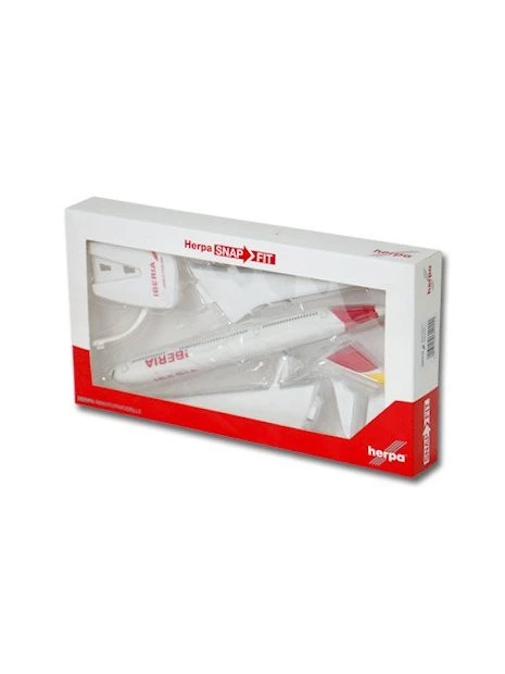 Cette maquette, à l’échelle 1/200e, en plastique, est aux couleurs de la compagnie aérienne Iberia, Líneas Aéreas de España.