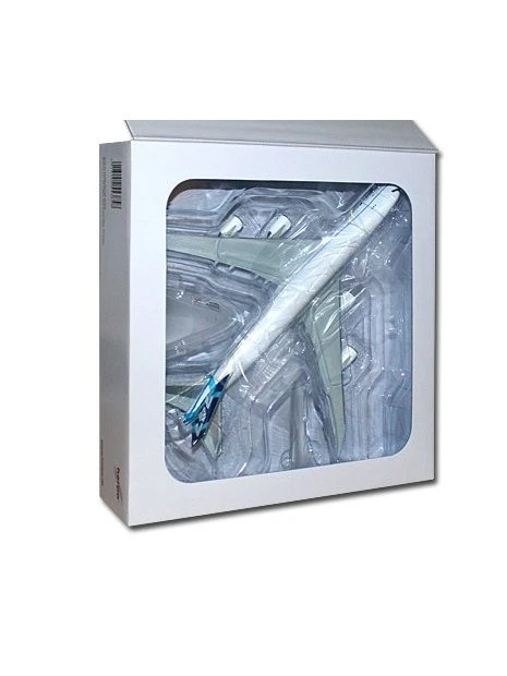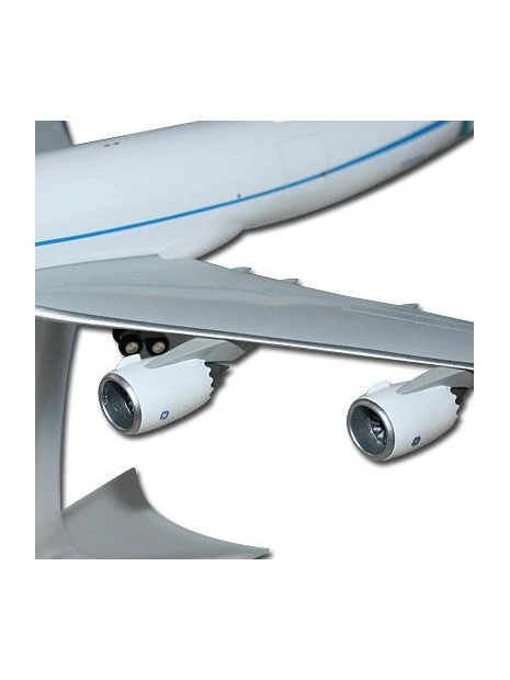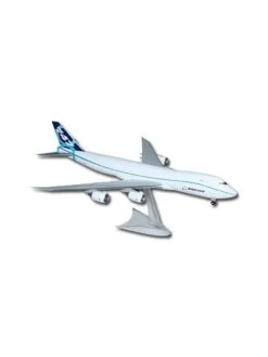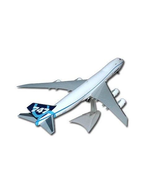 Maquette plastique Herpa, au 1/200e, d’un B747-8F aux couleurs de la maison mère Boeing avec train d’atterrissage sortie et socle.