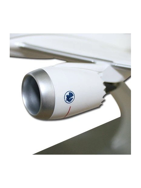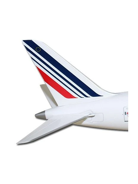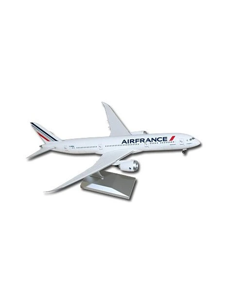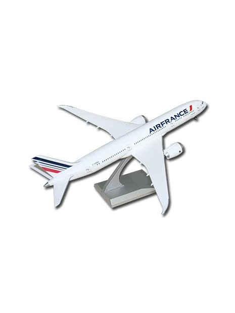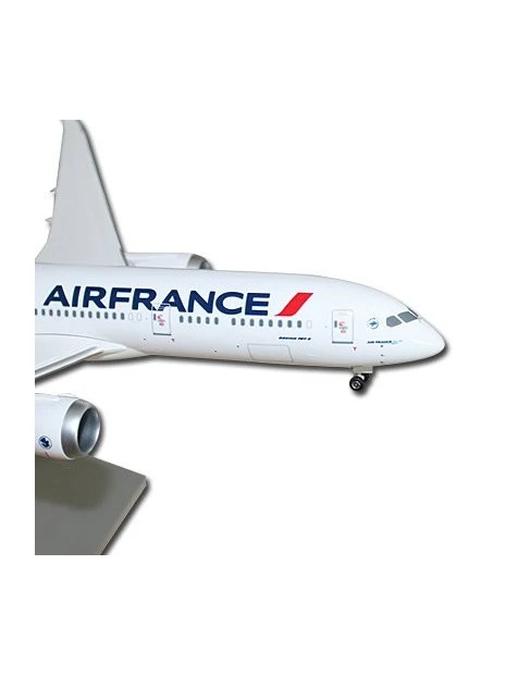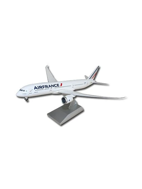 Maquette plastique, à l’échelle 1/200e, d’un Boeing 787-9 aux couleurs de la compagnie aérienne Air France avec train d’atterrissage sorti.