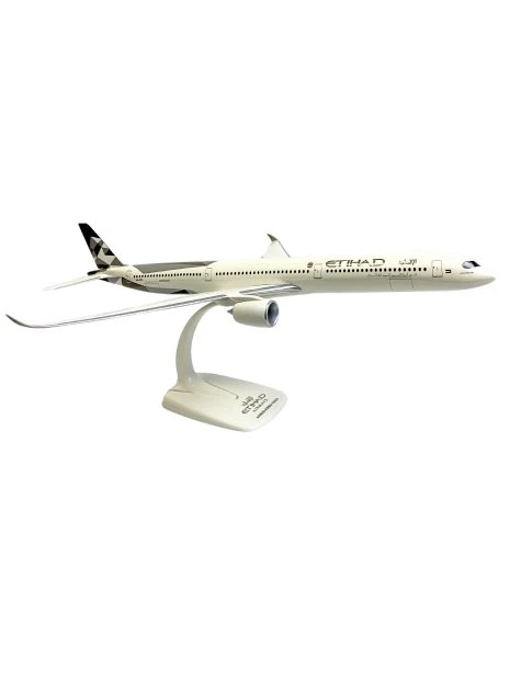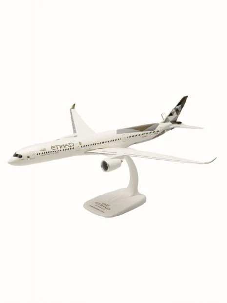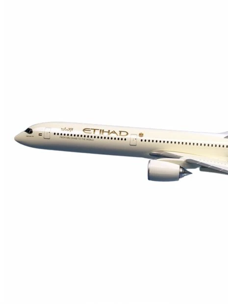 Maquette en plastique Herpa, au 1/200e, de l’Airbus A350-1000 de la compagnie aérienne émiratie Etihad Airways.