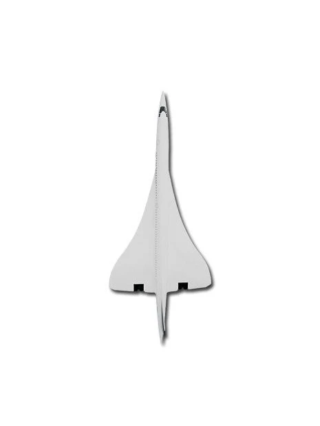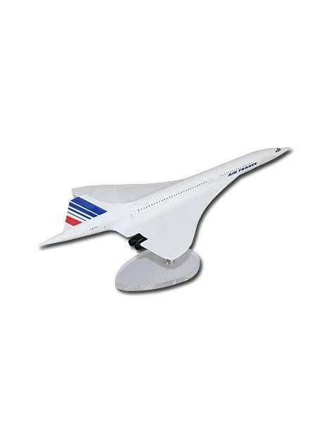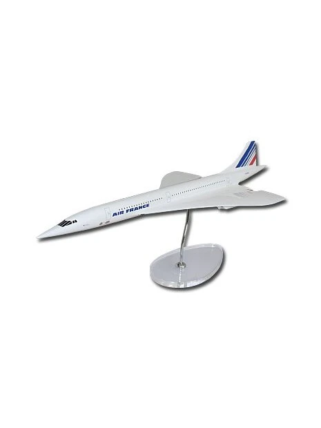Maquette de Concorde aux couleurs d’Air France. L’ensemble est monobloc : les ailes ne sont pas démontables. Pied en plexi transparent avec tige de support chromée.