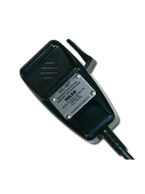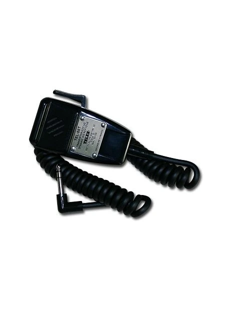 Micro à main avec cordon spirale et jack coudé (90°), livré avec son support métallique.