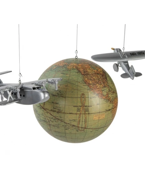 Trois avions en bois tournent autour de ce globe 1920 aux fuseaux collés à la main : le Lockheed Winnie Mae, le Boeing 314 Clipper de la Pan American China et le Douglas DC3 de la T.W.A..