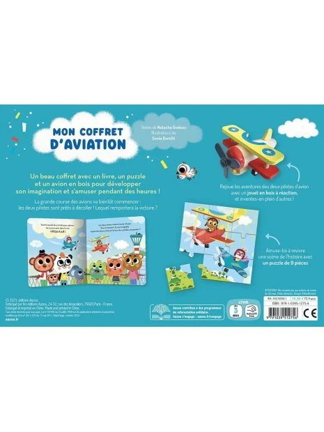 FLAP ! FLAP ! Mais quel est ce bruit ? Ça vient de l’aérodrome, où se déroule une folle course d’avions ! Qui des deux pilotes atteindra la ligne d’arrivée en premier ? Un joli coffret avec un livre tout-carton et une belle histoire de course d’avions, un bel avion en bois et un joli puzzle !