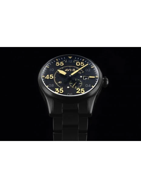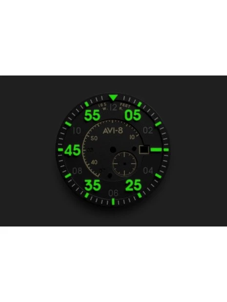 Lors de la conception du cadran, l’équipe AVI-8 s’est immédiatement tournée vers le cockpit du Spitfire. Prenant la lisibilité claire des jauges et des affichages de l’avion, la Type 300 utilise les index, les aiguilles et la disposition comme plan principal du cadran. Les index et les aiguilles sont somptueusement recouverts d’un lume suisse de haute qualité pour une lecture efficace dans des conditions de faible luminosité.