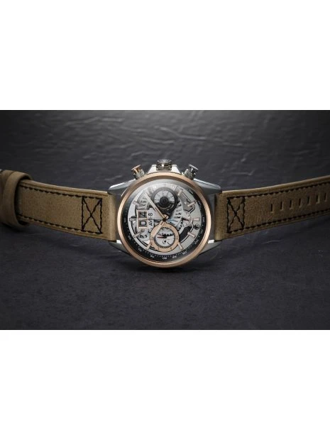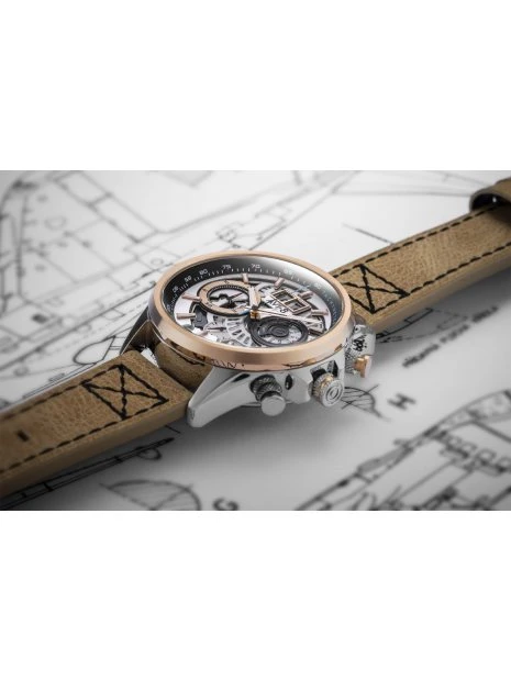 Aucun détail n’a été laissé au hasard. À la position 3 heures, le mouvement repensé est désormais doté d’un affichage à disque capable d’une remarquable mesure de temps intermédiaire au 1/20e de seconde. Avec la lecture des secondes et des minutes du chronographe, le Matador est un appareil de chronométrage complet. La lecture de l’heure s’effectue via des aiguilles lumineuses lisibles et des index à facettes. En attachant la montre au poignet, la coupe est confortable grâce à des cosses bien conçues et à un bracelet en cuir souple avec un point de croix d’influence militaire conçu pour un port et un entretien faciles.