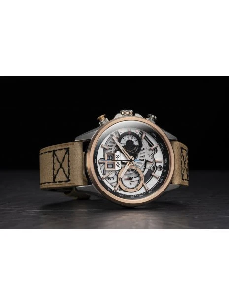 Le Hawker Harrier « Jump Jet » a réalisé son service dans plusieurs forces aériennes et navales au cours de la seconde moitié du XXe siècle. Il a représenté une percée dans la conception de l’aviation et a servi de nombreuses missions avec distinction. Pour rendre hommage aux variantes de ce célèbre jet, AVI-8 présente la dernière version de sa famille de chronographes Harrier inspirée des avions qui ont volé pour la marine espagnole, surnommé le « Matador ». En fonctionnement à plein temps, le Matador s’anime avec un vrombissement qui crée une expérience dynamique semblable à celle d’un Harrier en plein vol.