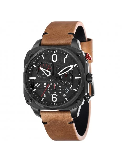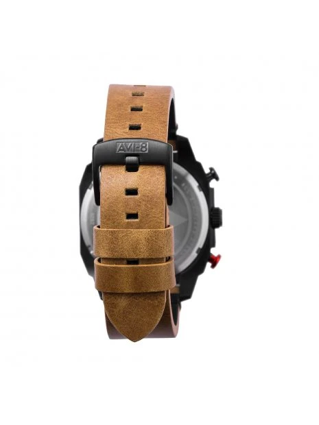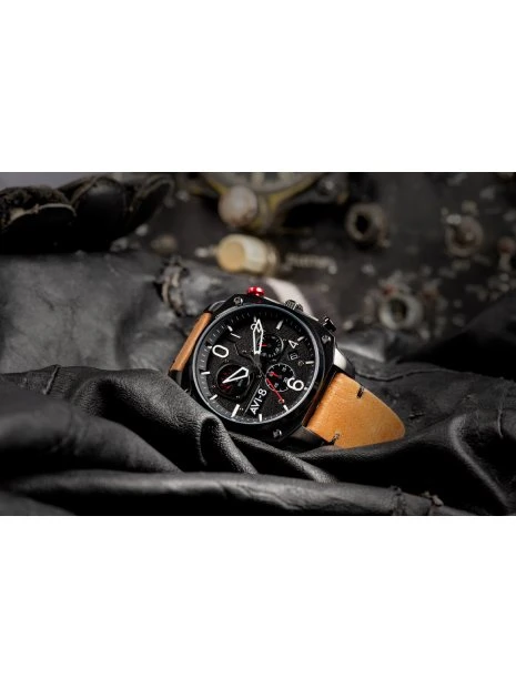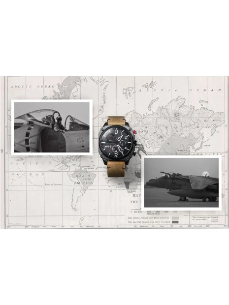 Bien attaché au poignet avec un bracelet en cuir véritable vintage cousu à la main, le chronographe rétrograde Hawker Hunter est une montre impressionnante, fonctionnelle et unique inspirée de l’aviation comme aucune autre.