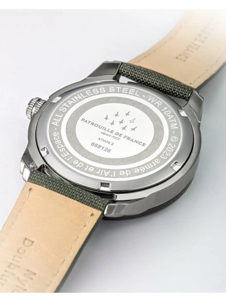 Dans la Patrouille de France, le pilote Athos 2 évolue en position d’intérieur gauche. Le modèle de montre Athos 2 avec bracelet tissu kaki s’inspire des Nato de l’Armée : une évocation d’unité et de cohésion.