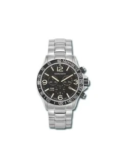Montre à quartz de mouvement suisse, spécialement conçue pour les aviateurs, étanche jusqu’à 100 mètres, avec boîtier en acier inoxydable. Cadran noir et bracelet acier.