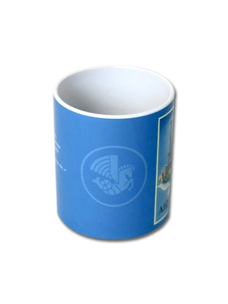 Air France a décidé de lancer sa nouvelle collection de mugs en porcelaine, ayant pour décoration deux cercles bleus représentant la planisphère, entourée de décoration sur fond rouge.