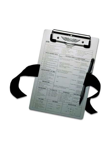 Planchette de vol simple en aluminium au format A5. Elle possède une sangle velcro élastique, un porte-stylo et une attache en métal de 12 cm de largeur. Des informations utiles au vol I.F.R. sont représentées sur la planche.