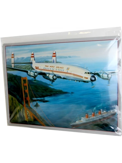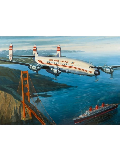 L’image est tirée d’une reproduction d’une huile de Benjamin FREUDENTHAL, représentant un Lockheed Super Constellation TWA au-dessus du Golden Gate.